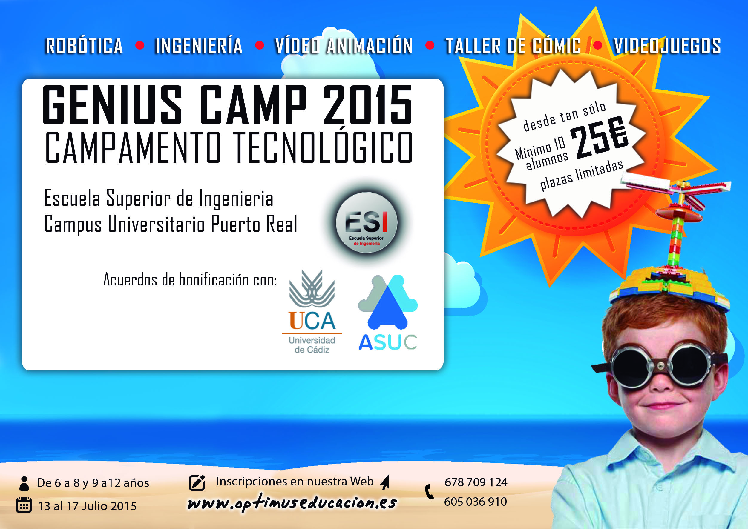 GENIUS CAMP Campamento Tecnológico hará que palabras como estructuras, diseños, programaciones, cálculos matemáticos, ensayos, errores, resolución de problemas, y negociaciones de equipo, son habilidades y competencias que trabajaran los participantes en Genius Camp mientras se enfrentan a distintos retos planteados. Este campamento tendrá lugar del 13 al 17 de Julio, en horario de 9 a 14 horas de lunes a viernes. El formato que ofrece a la comunidad universitaria es para hijos de entre 6 a 12 años de edad, divididos en dos niveles, 6 a 8 años (Kids) y 9 a 12 años (Juniors). Ver acuerdos de descuentos UCA y distribución de módulos en la web: https://www.optimuseducacion.es/inscripciones-2/genius-camp-inscripciones/form-genius-camp-uca-esi/